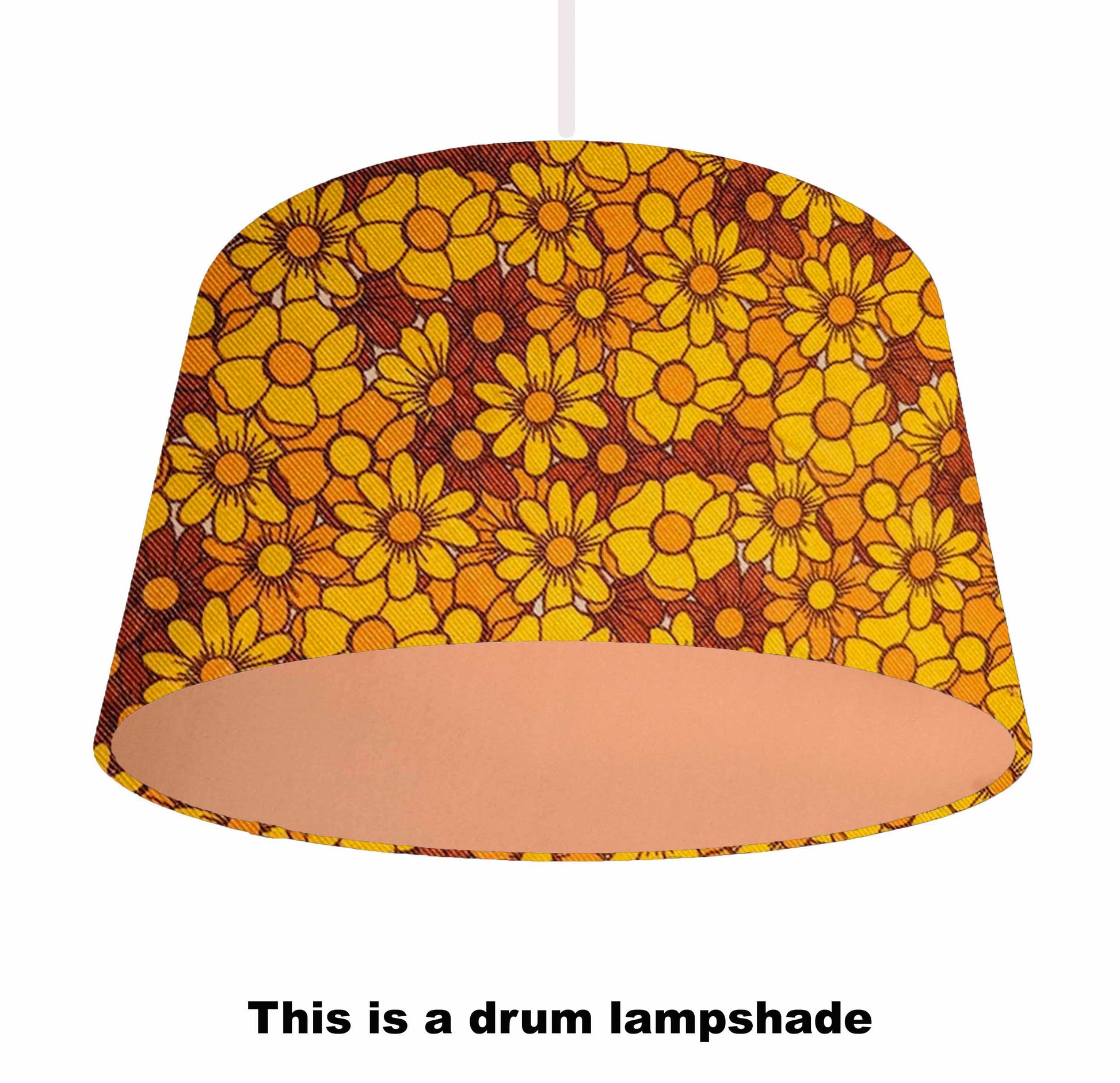 A fun, bold 70s themed floral lampshade. Available in 5 different diameter sizes and a choice of brushed gold or copper (bronze) lining.
