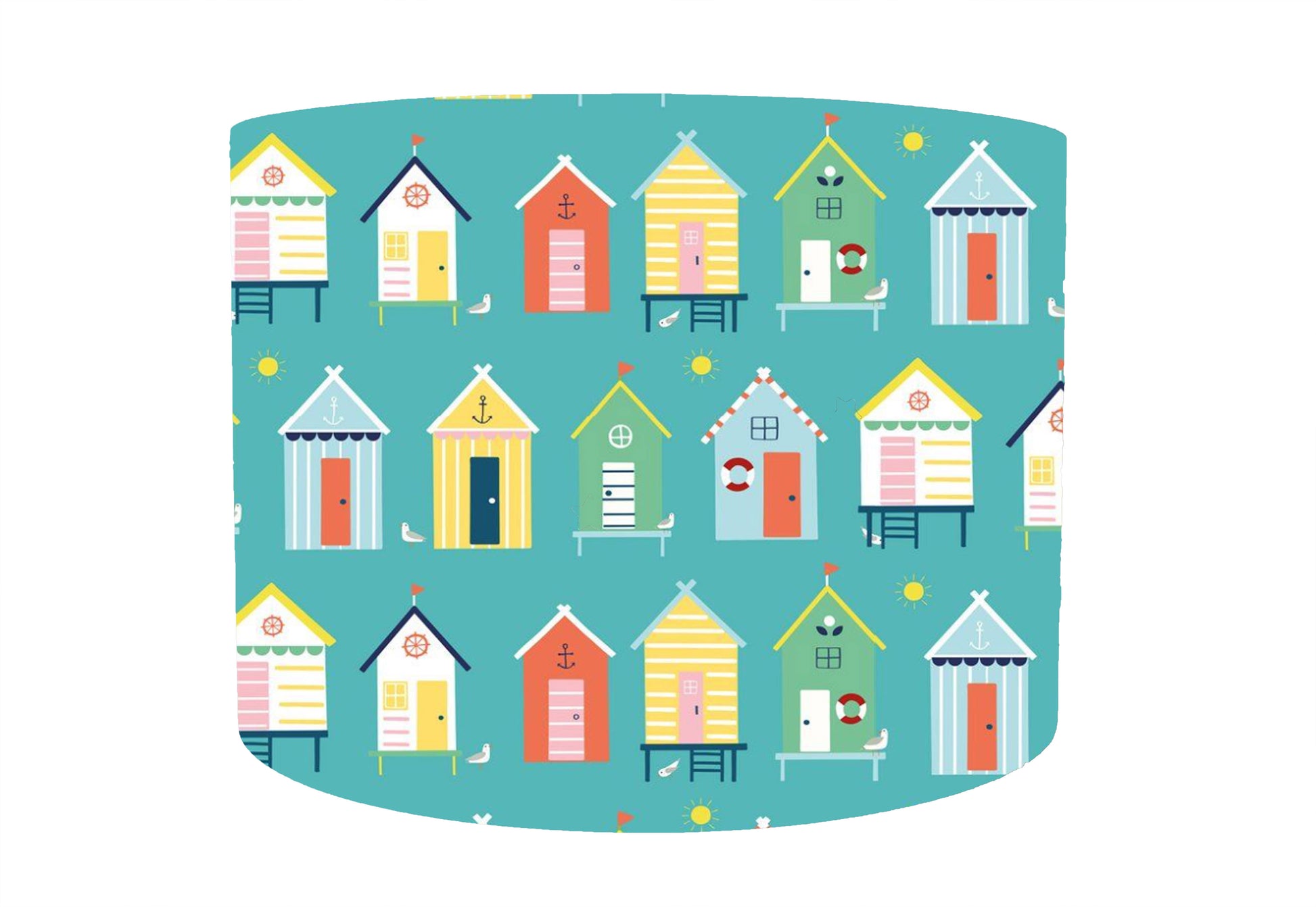 A fun beach hut lampshade, In a gorgeous shade of teal, with different beach huts. This lampshade would suit a nautical styled room or for those who love to inject some fun into their room!