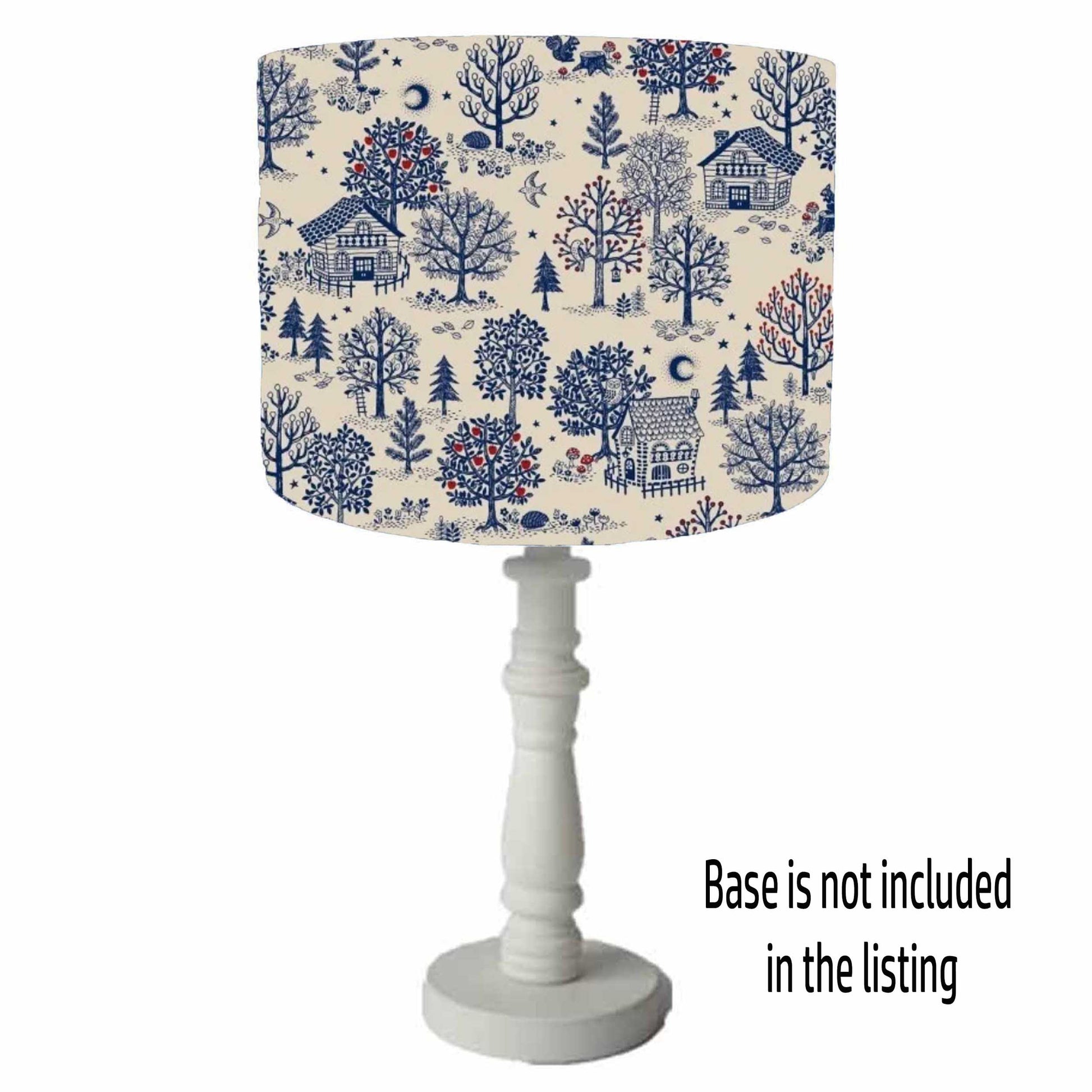 A lovely cabin and woodland scenery lampshade, In a lovely contrasting blue and white with a touch of red detailing.