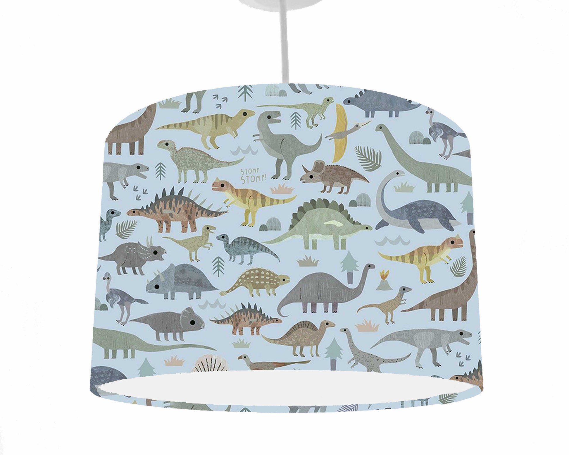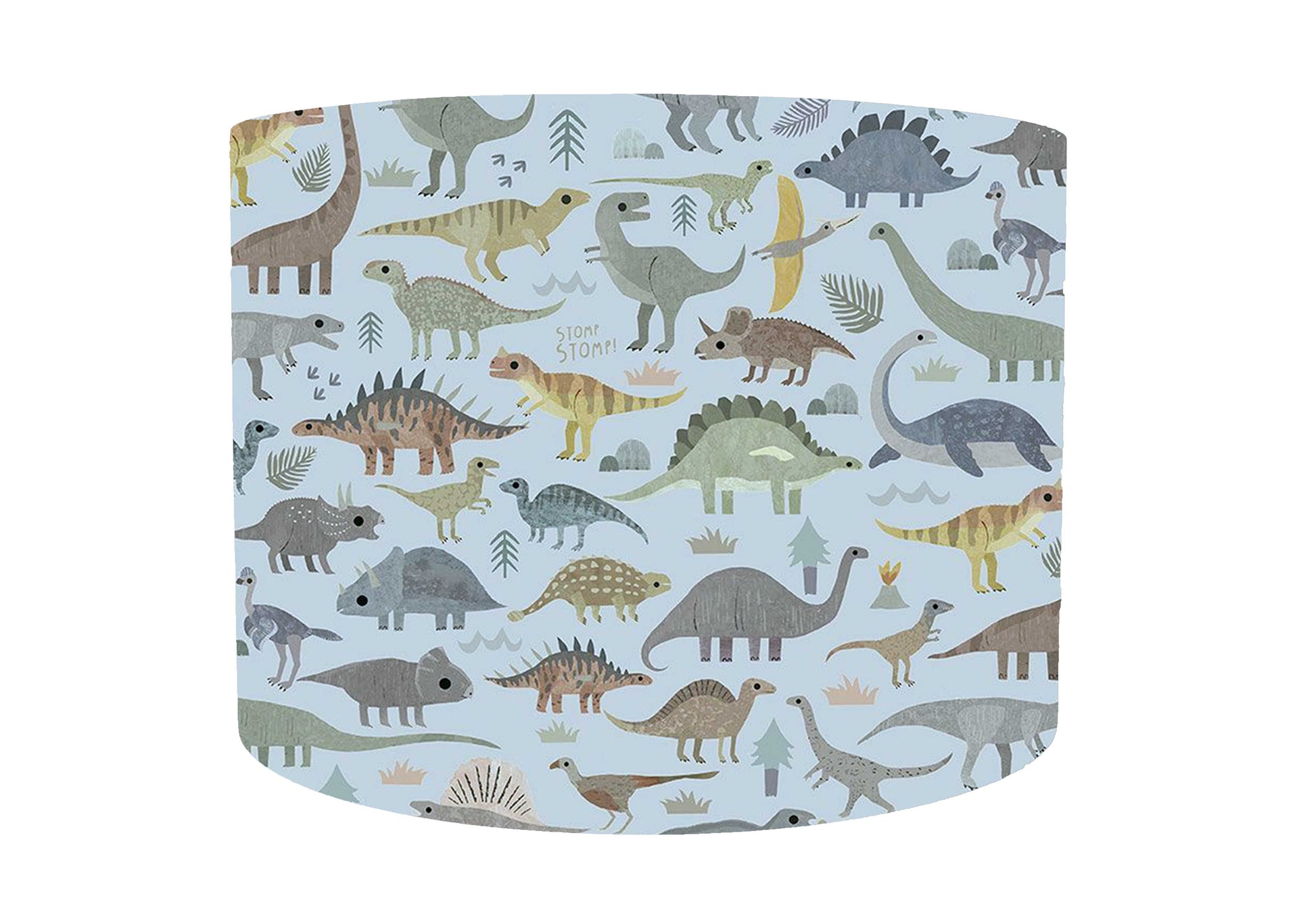 A blue dinosaur lampshade, perfect for a dinosaur themed nursery or bedroom.