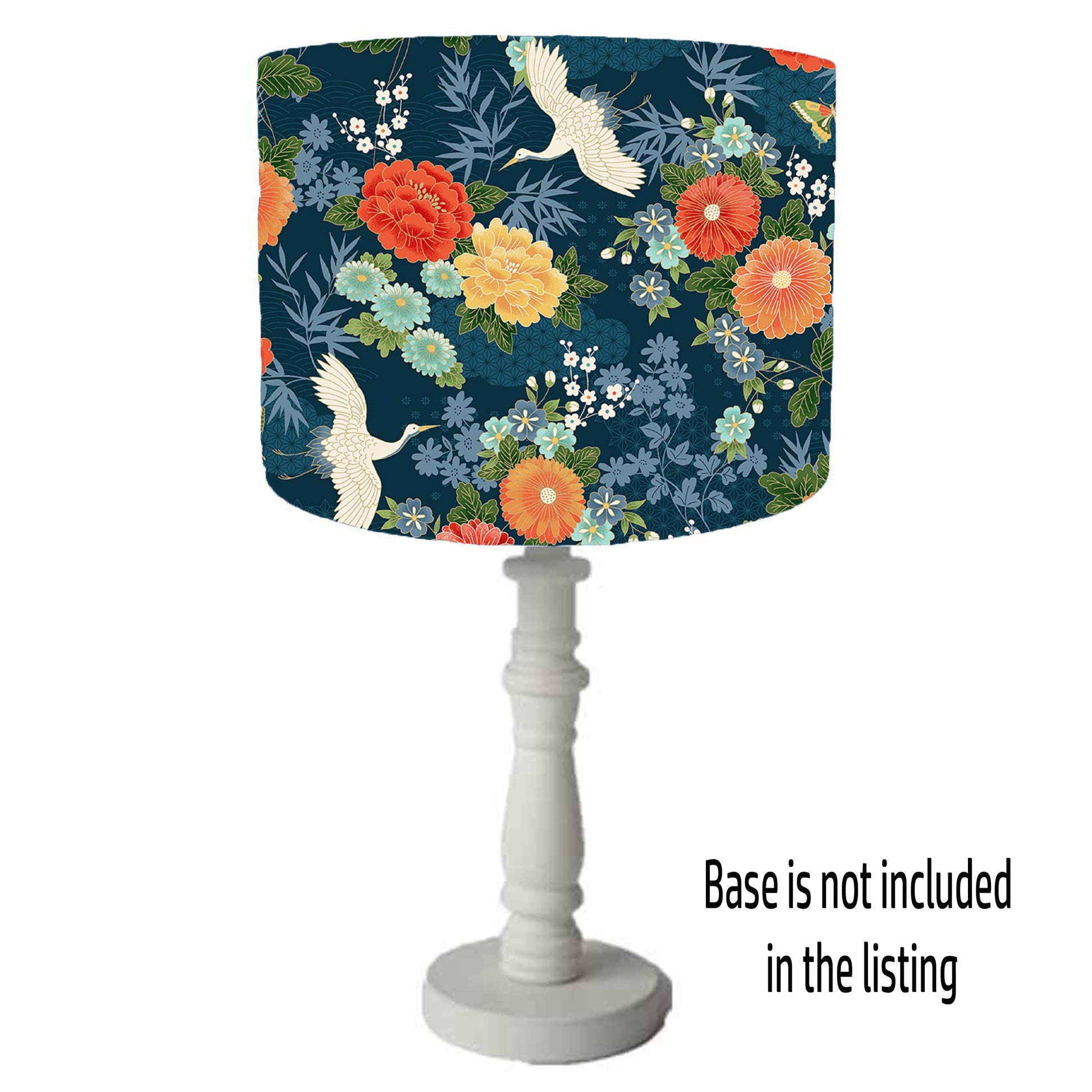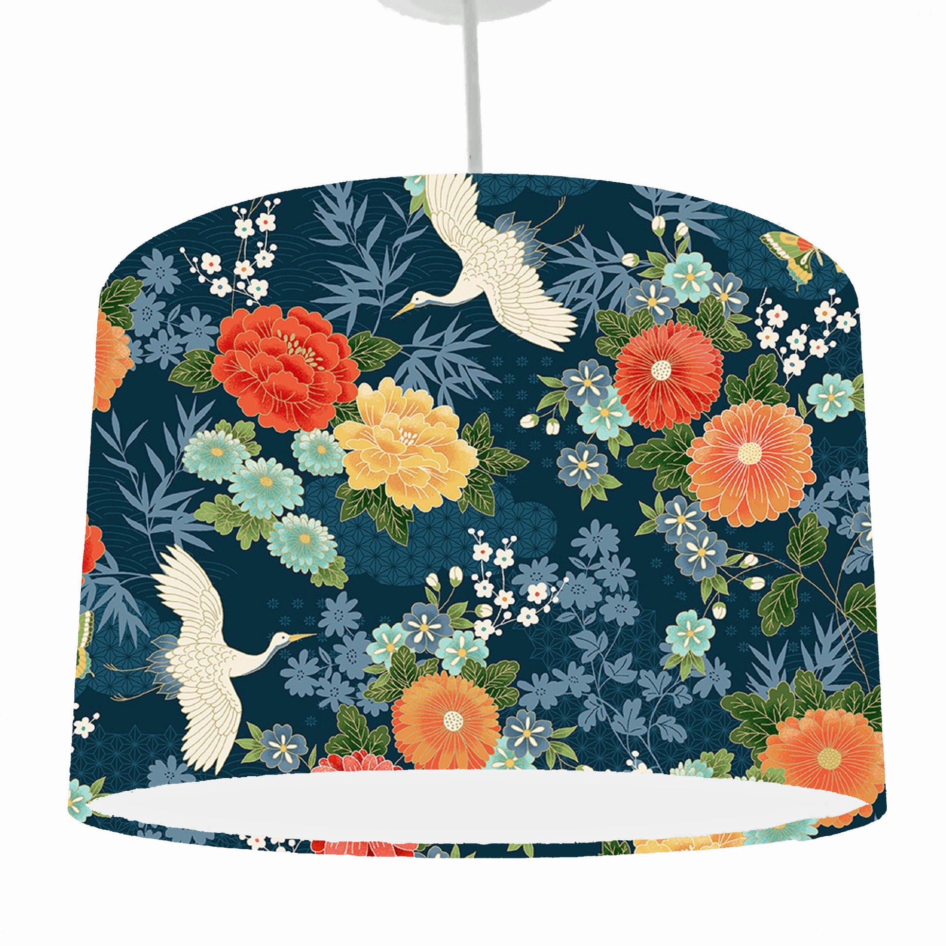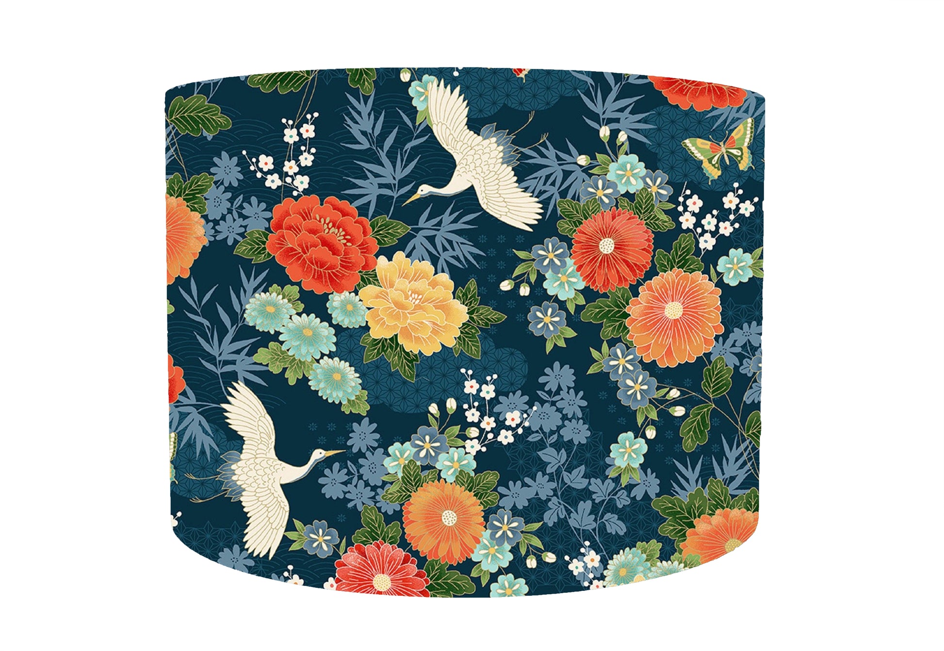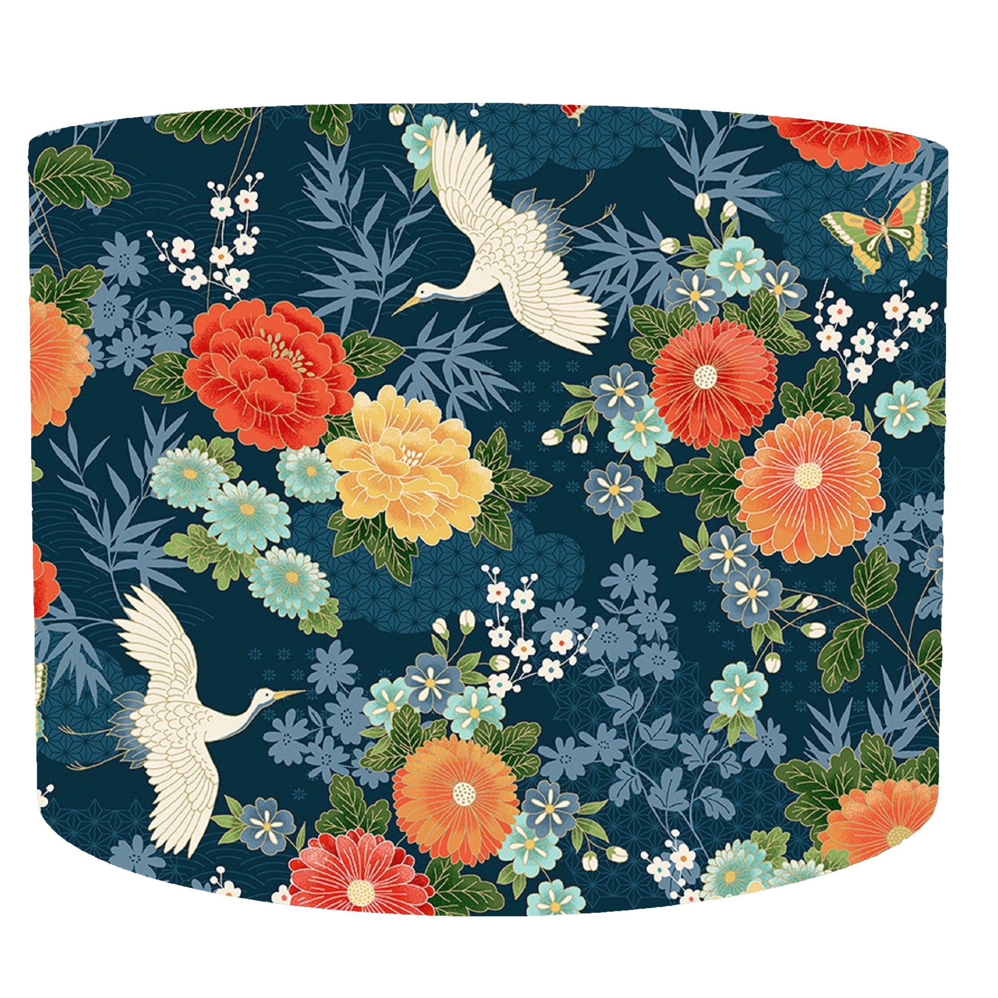 A dark blue Japanese inspired lampshade.With different flowers and cranes, this is a beautiful lampshade. It also has metallic gold detailing, adding a luxurious feel to the lampshade.