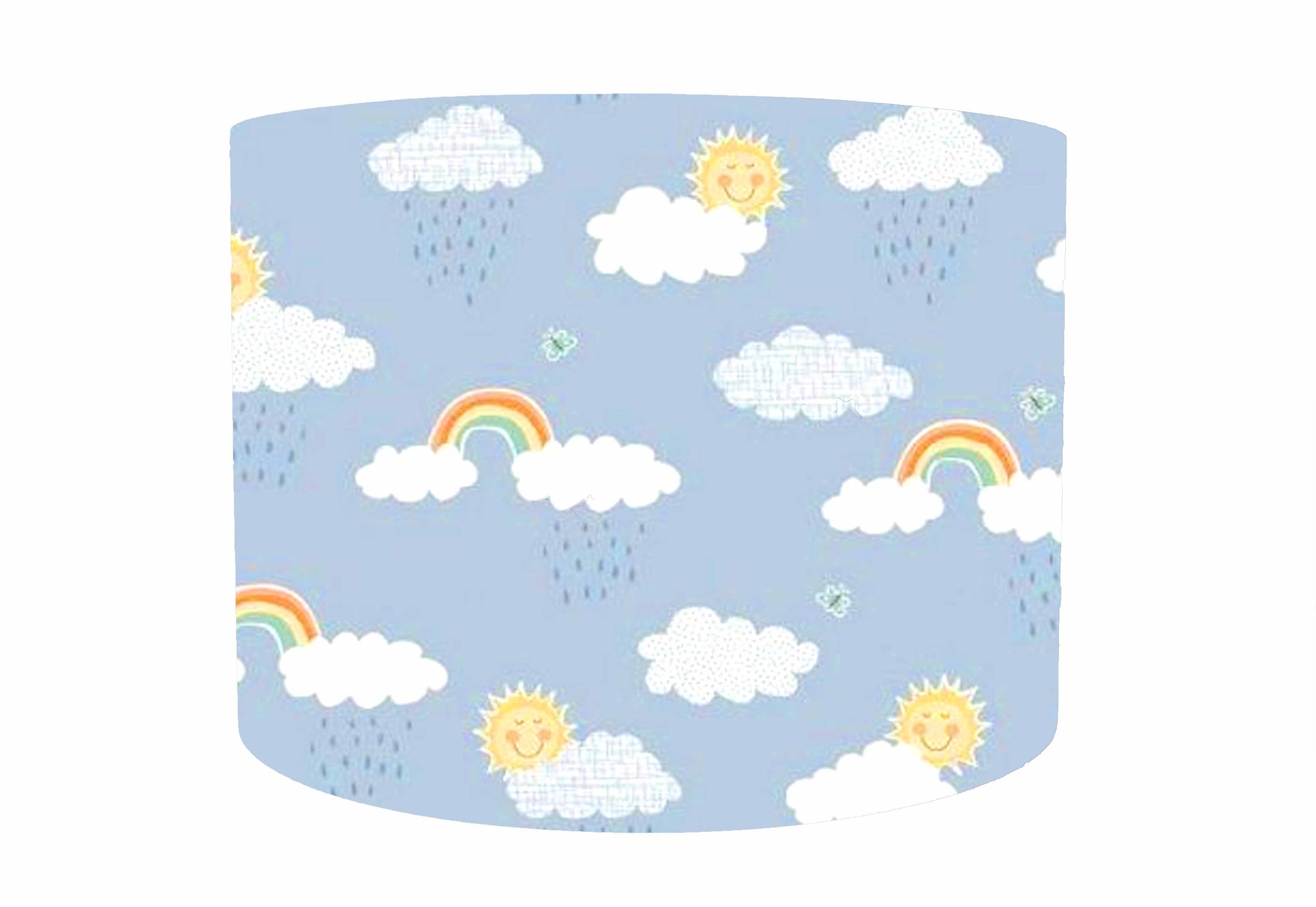 A cute blue sunshine, rainbow and cloud themed lampshade. Perfect for your little one's bedroom.