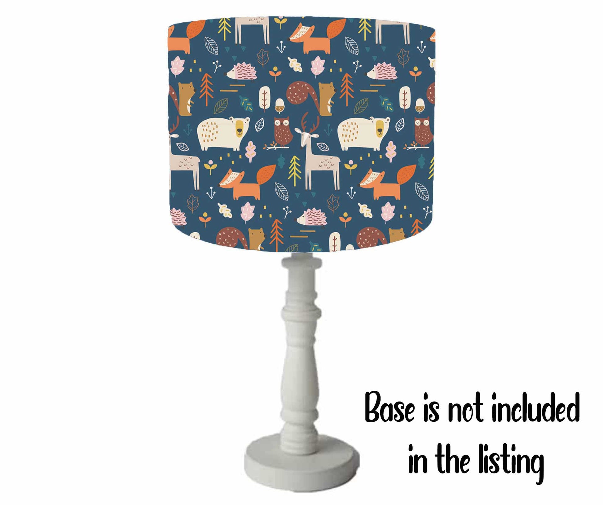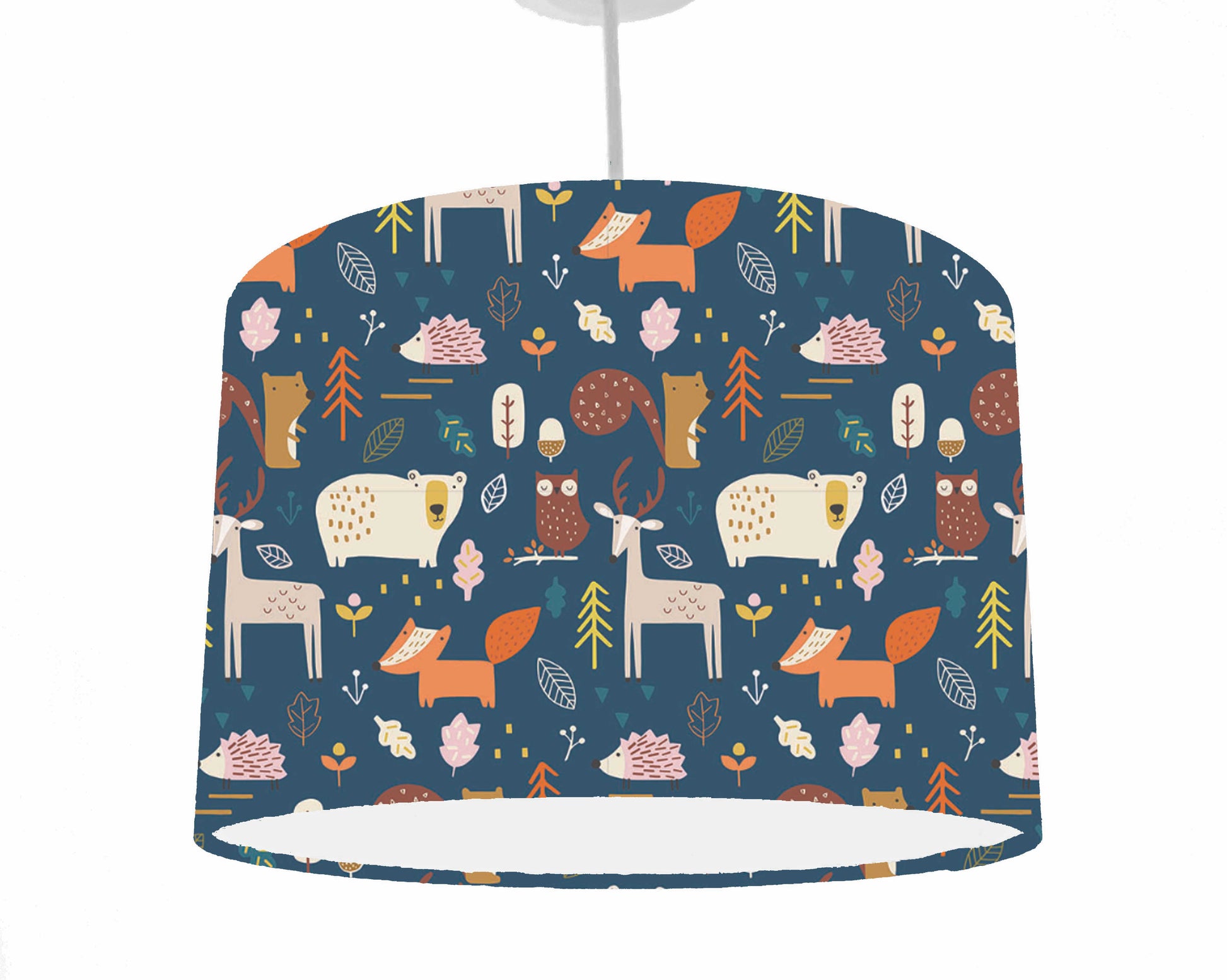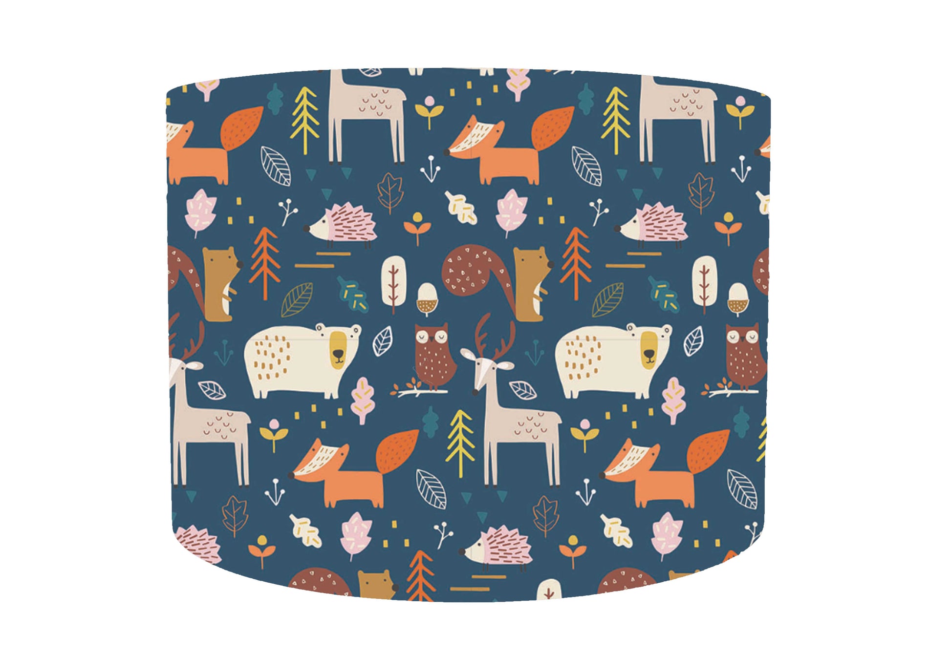 A dark blue lampshade with cute woodland animals. Ideal lampshade for a woodland themed nursery or bedroom or for those who loves animals. Available in three diameter sizes and can be made to fit a ceiling pendant or table or floor standing base.