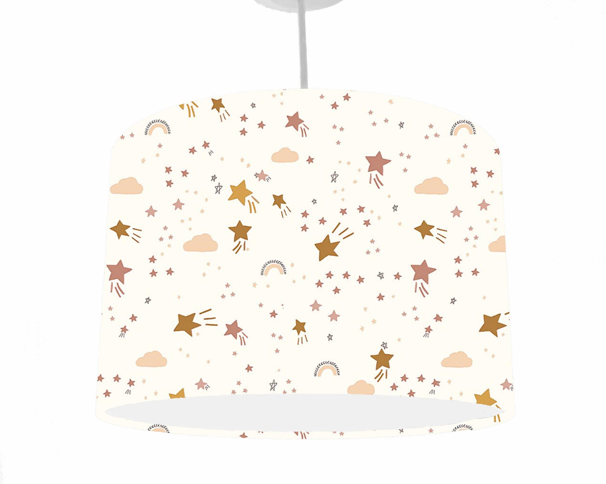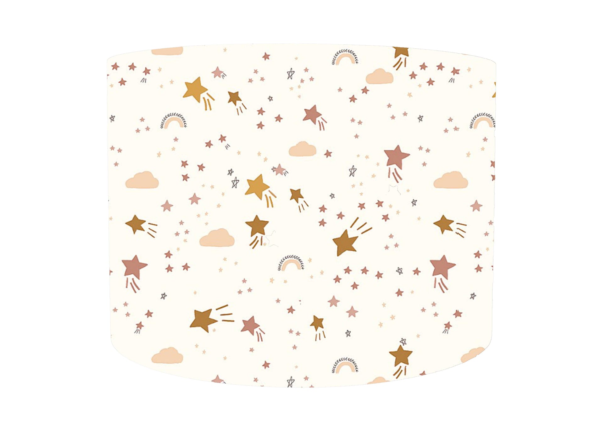 A lovely star, rainbow and cloud lampshade in neutral colours set on a cream background,