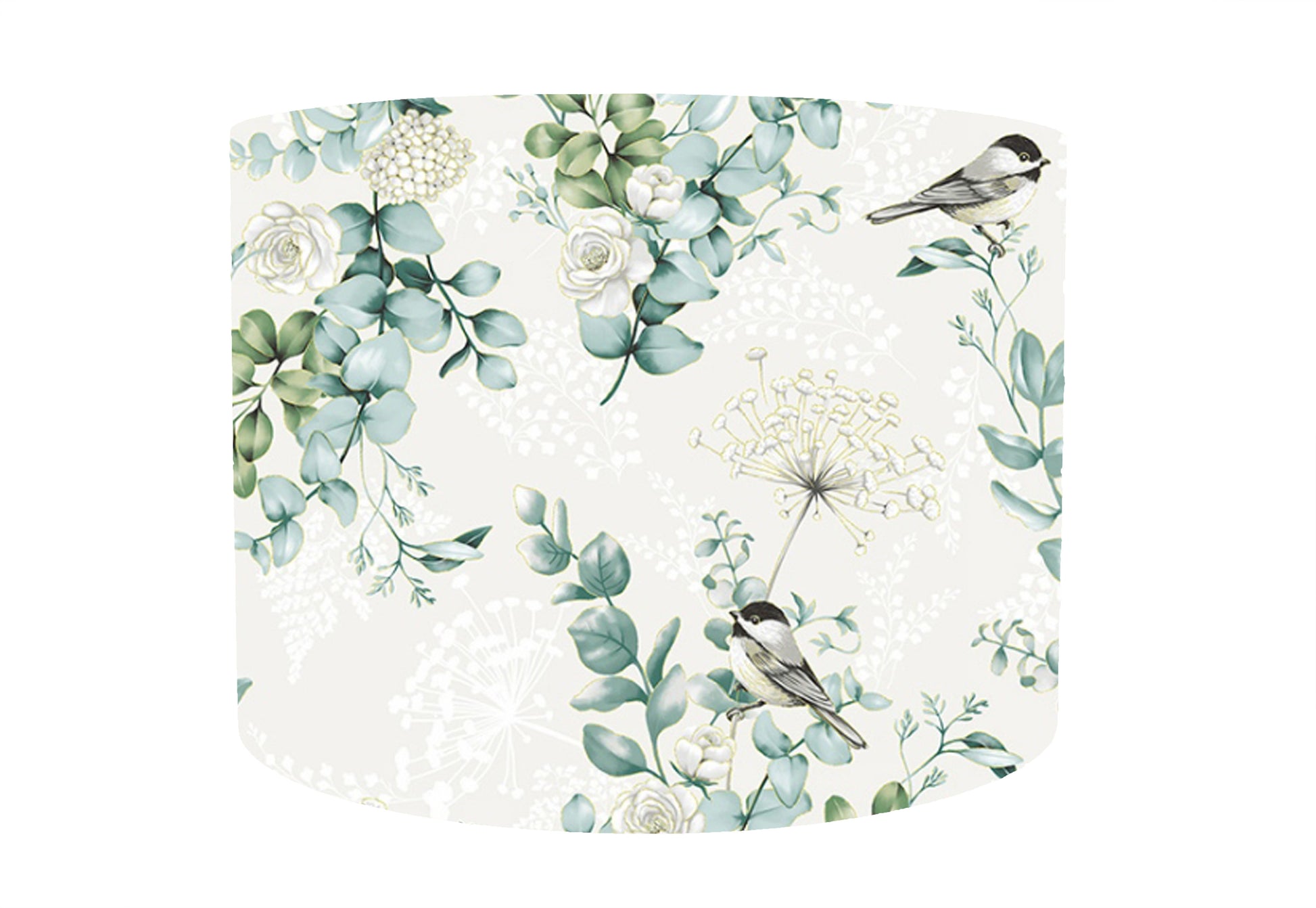 A birds and leaves themed lampshade. Set on a white background. This is a beautiful lampshade and would suit a nature themed room or great for those who loves birds.