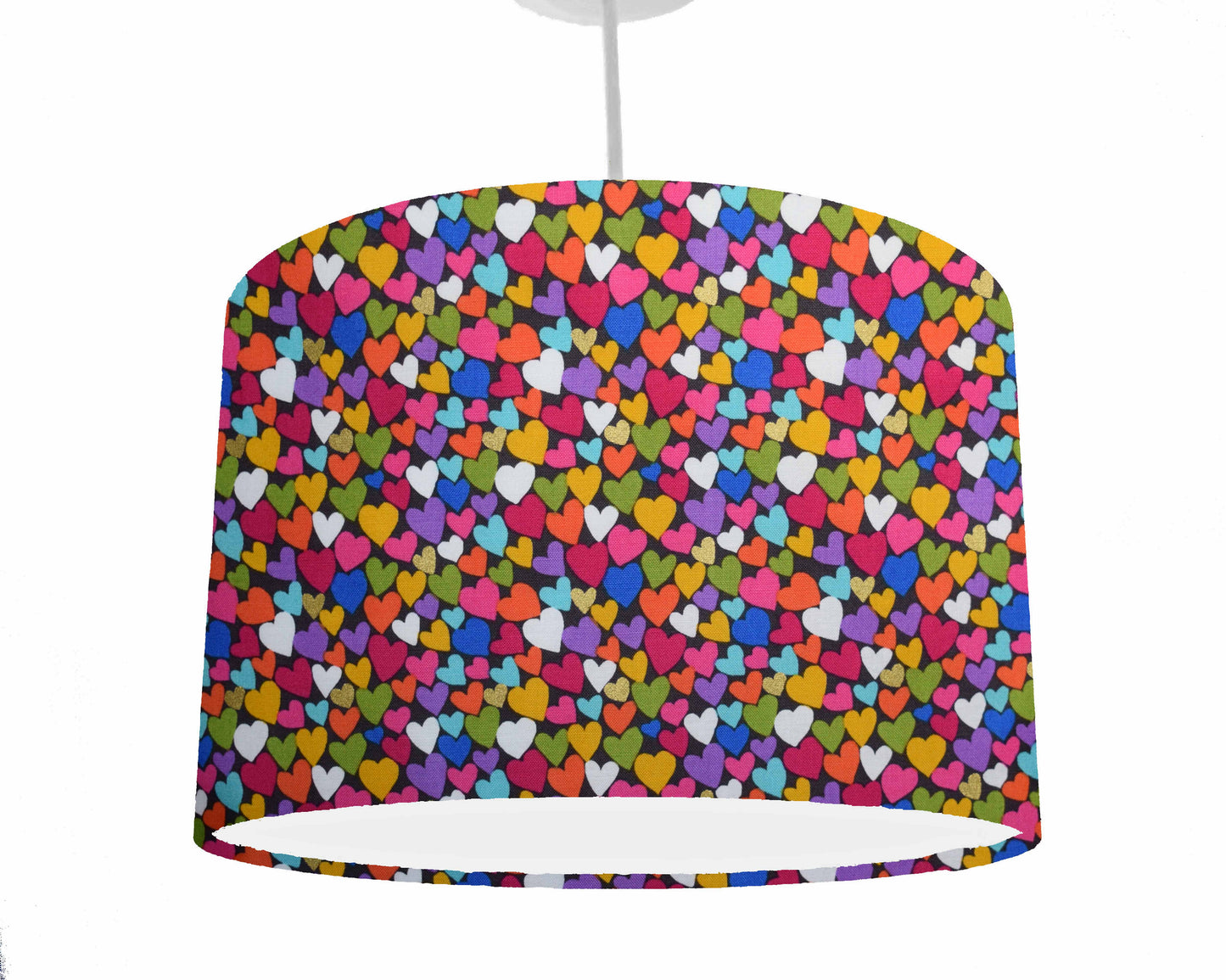 A colourful hearts themed lampshade, With different coloured hearts set on a black background. This would suit a rainbow themed bedroom.