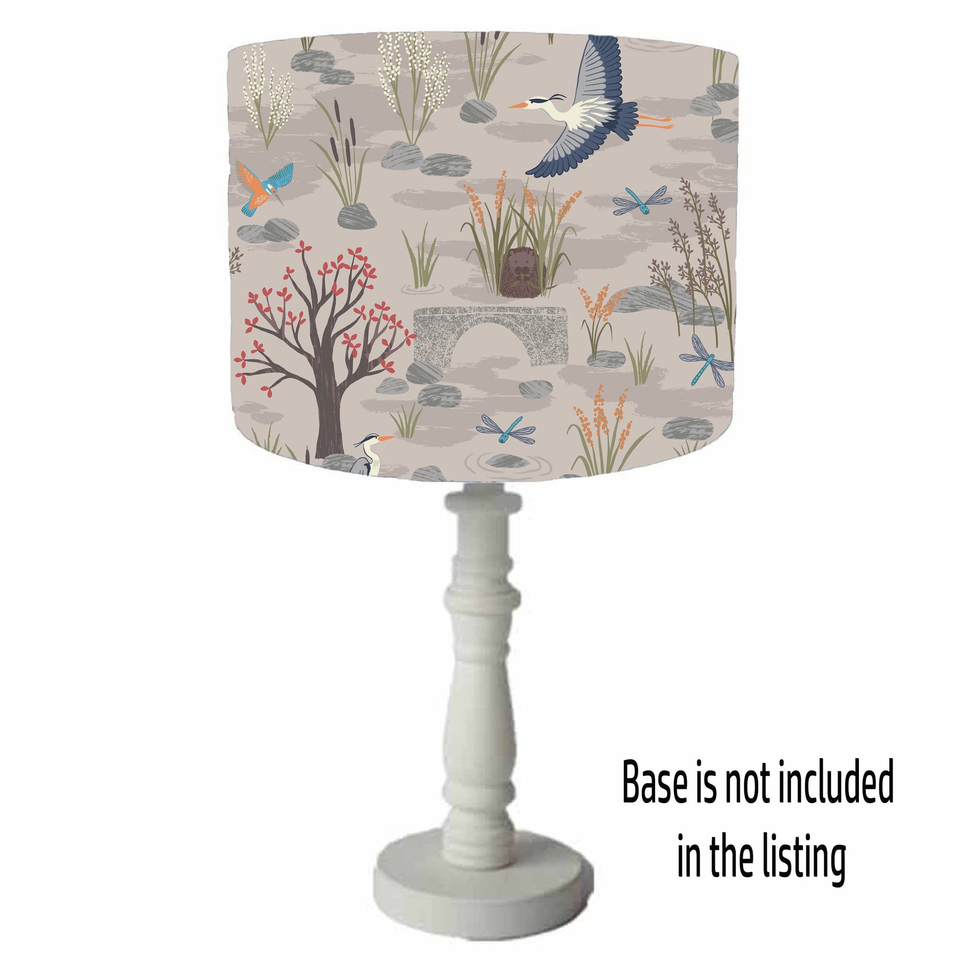 A water meadow scene set on a natural background. With scenes of herons and kingfishers, this is a lovely riverside scenic lampshade with a countryside rustic feel. It would be great in a living room or bedroom or for those who love nature and country side.