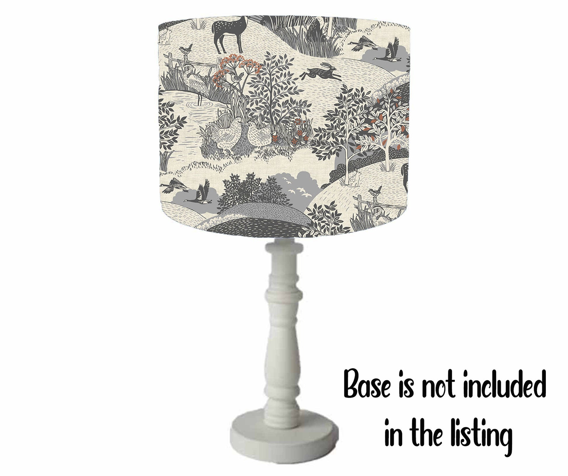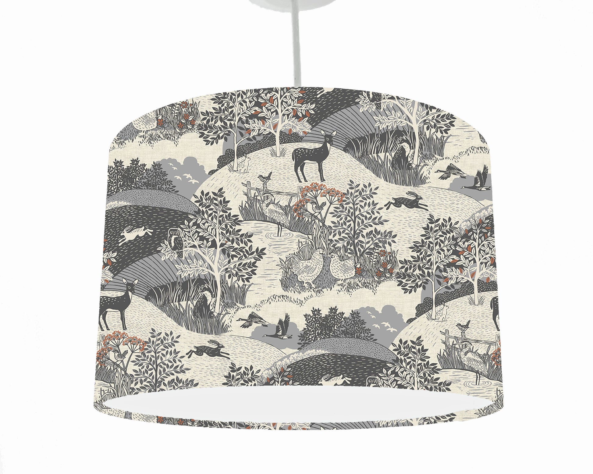 A hedgerow scene lampshade, in grey and lovely copper detailing. Available in a white lining.
