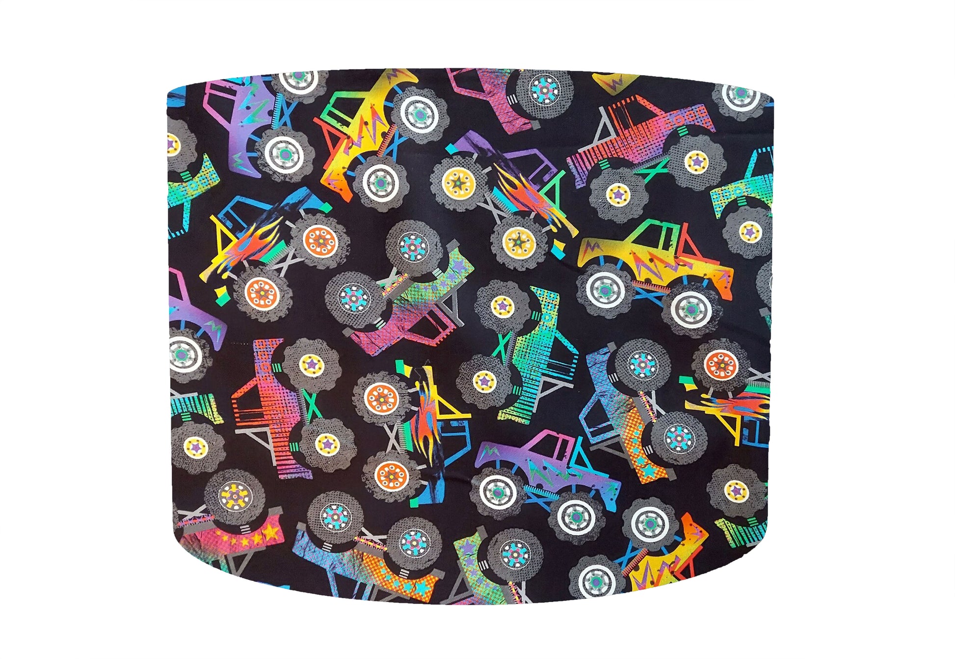 A monster truck lampshade, with colourful trucks set on a black background.