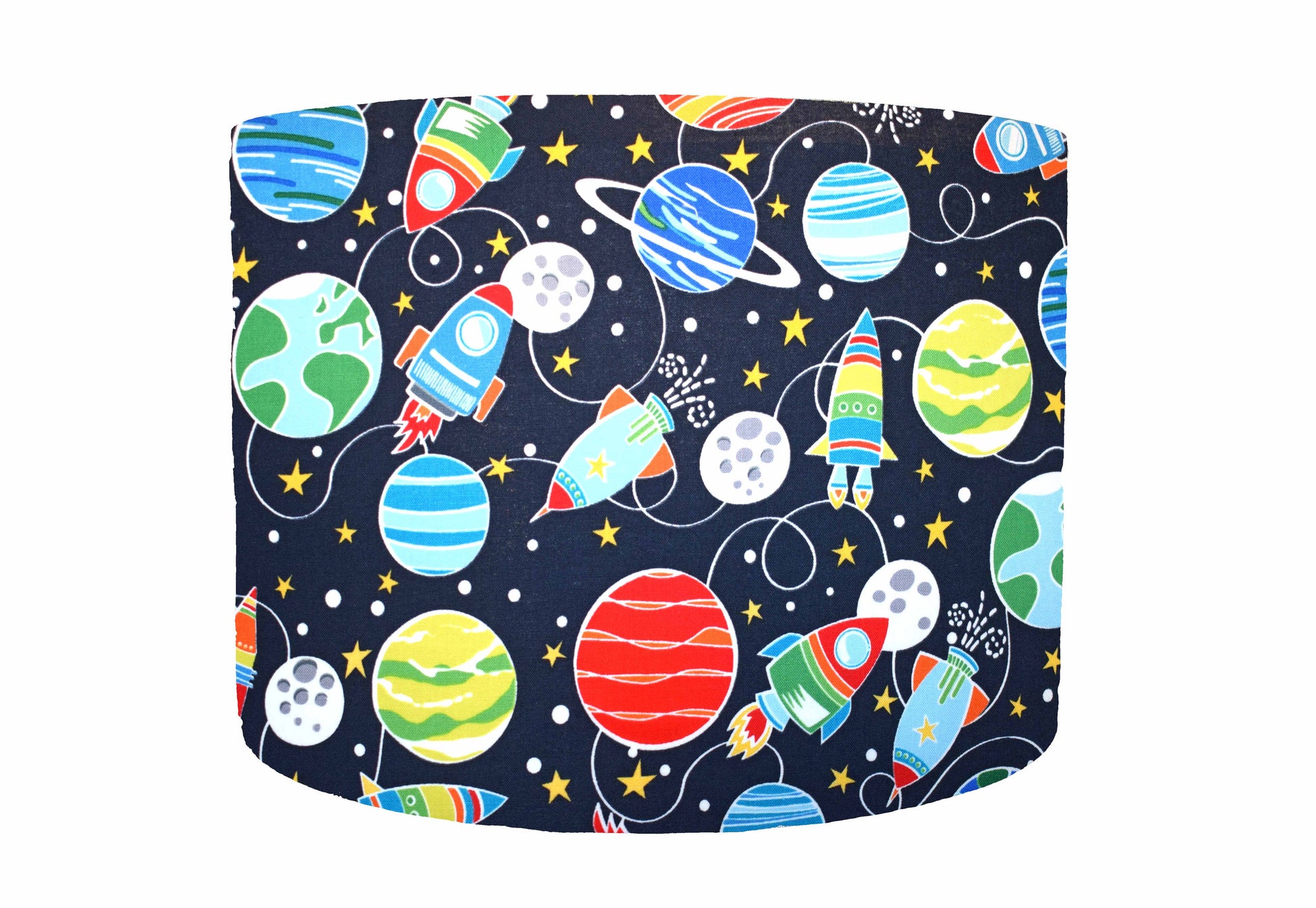 A glow in the dark space themed lampshade, with rockets in space. This lamp shade would be the perfect addition to a space bedroom.