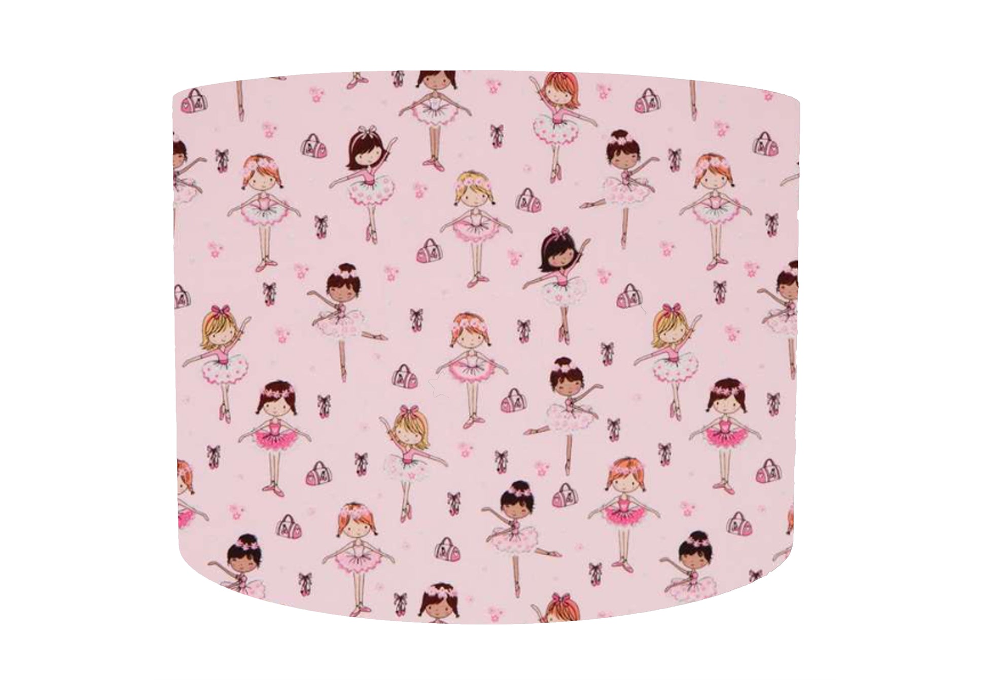 A ballet themed lampshade, with ballerinas set on a pink background.