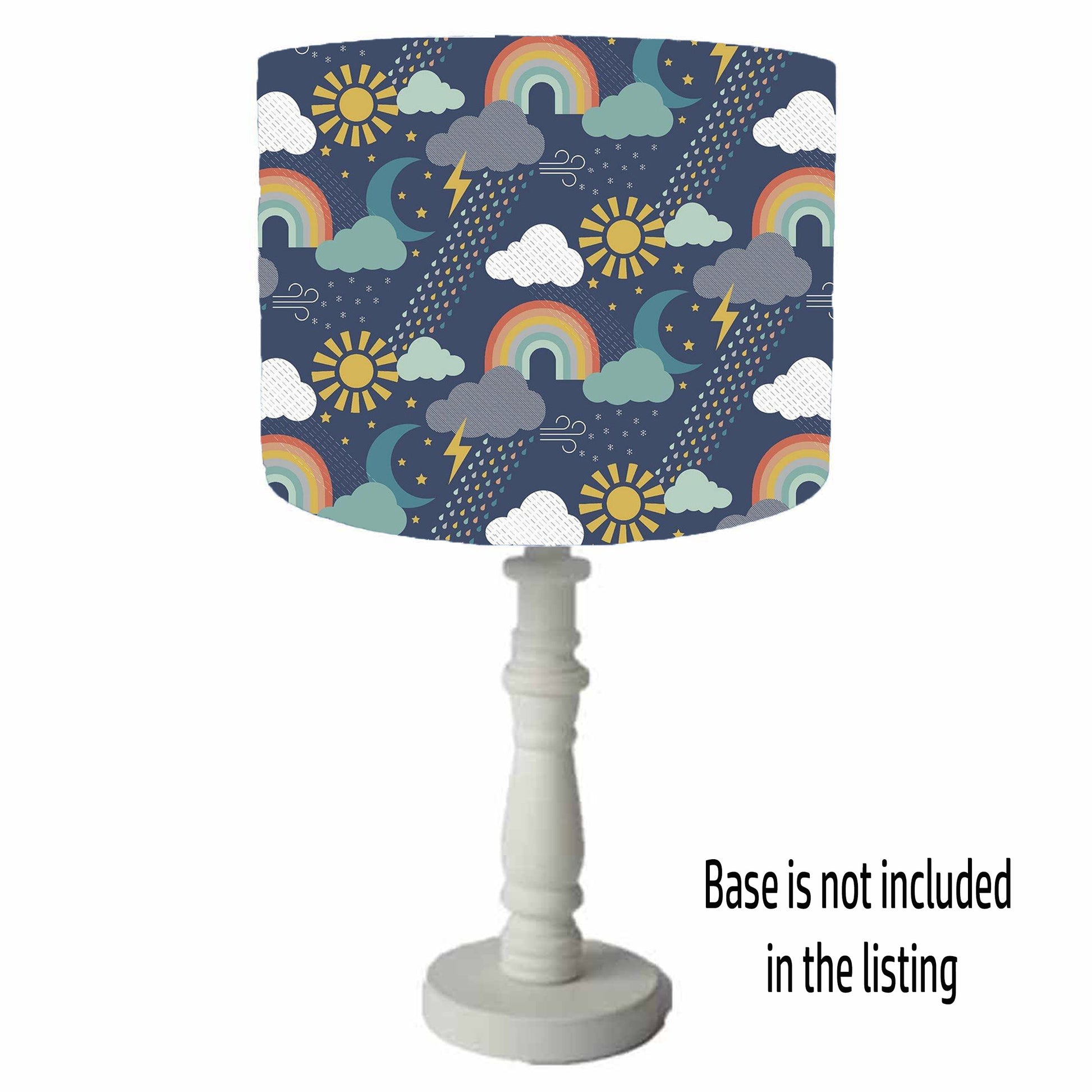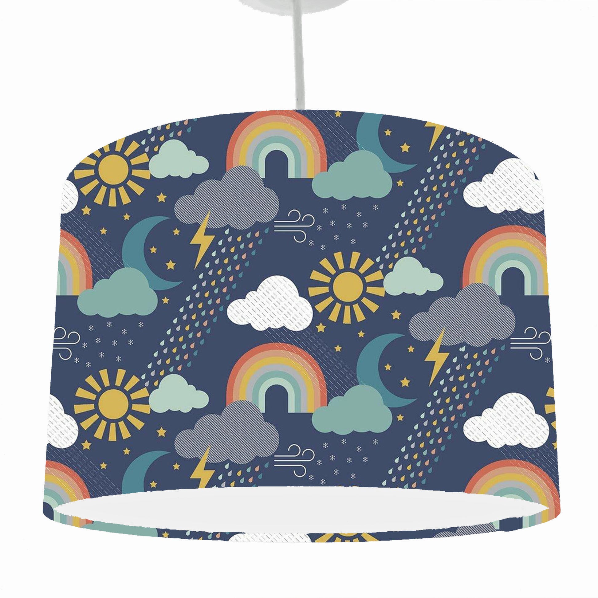 A dark blue lampshade with rainbows, clouds, thunder, the perfect lampshade for a rainbow baby.