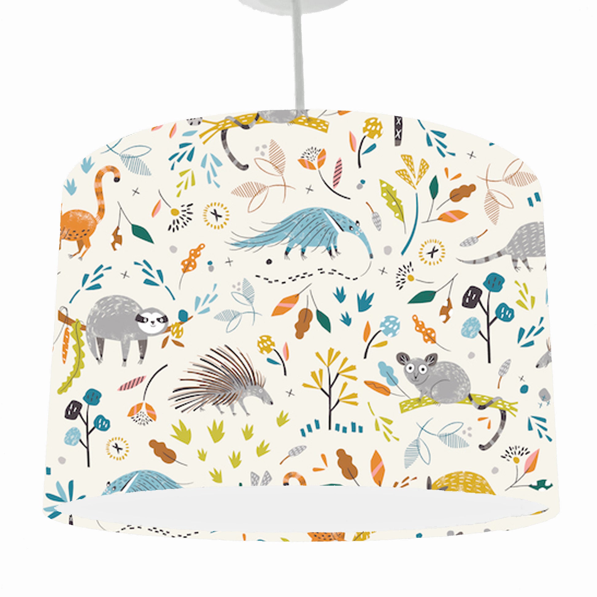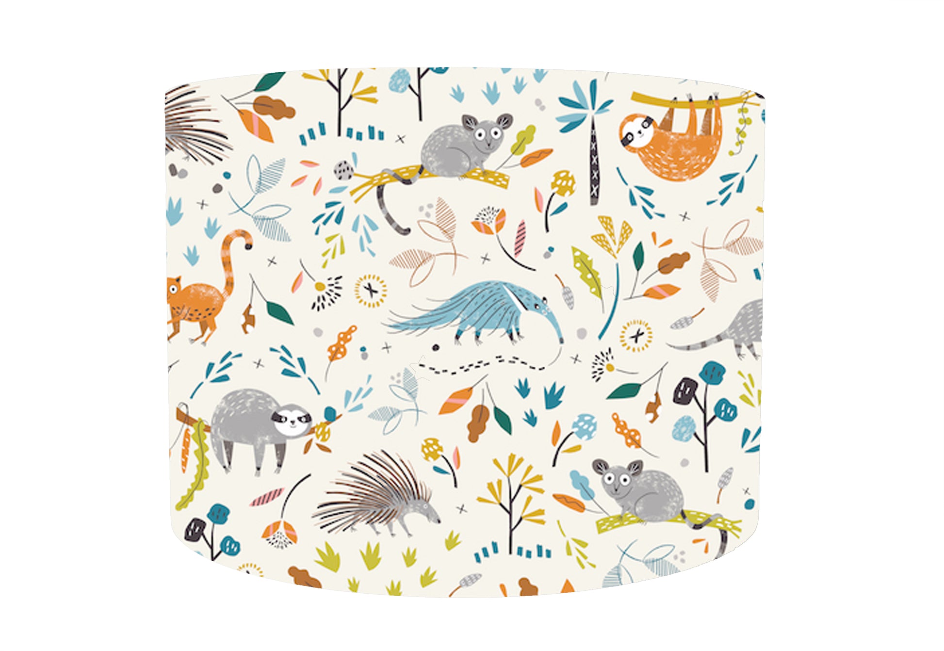 An adorable jungle animals lampshade set on a neutral cream background. This light shade has different rainforest jungle animals, all colourful making this an ideal lamp shade for a child's room or nursery. It would make a great gift for a new baby and be the perfect accessory to a jungle themed room.