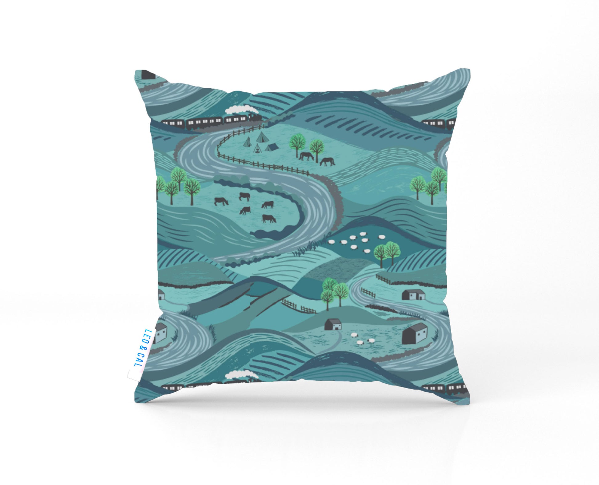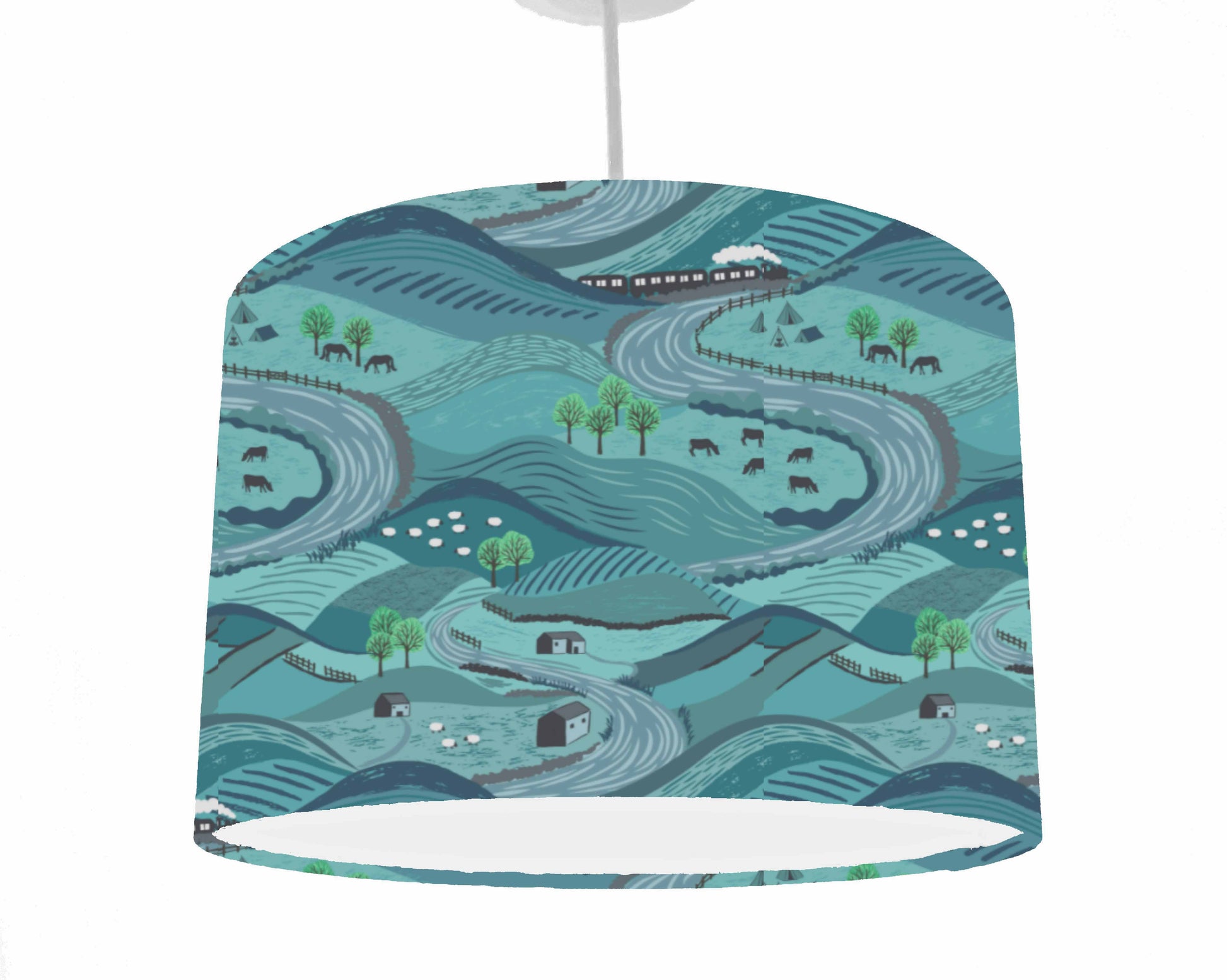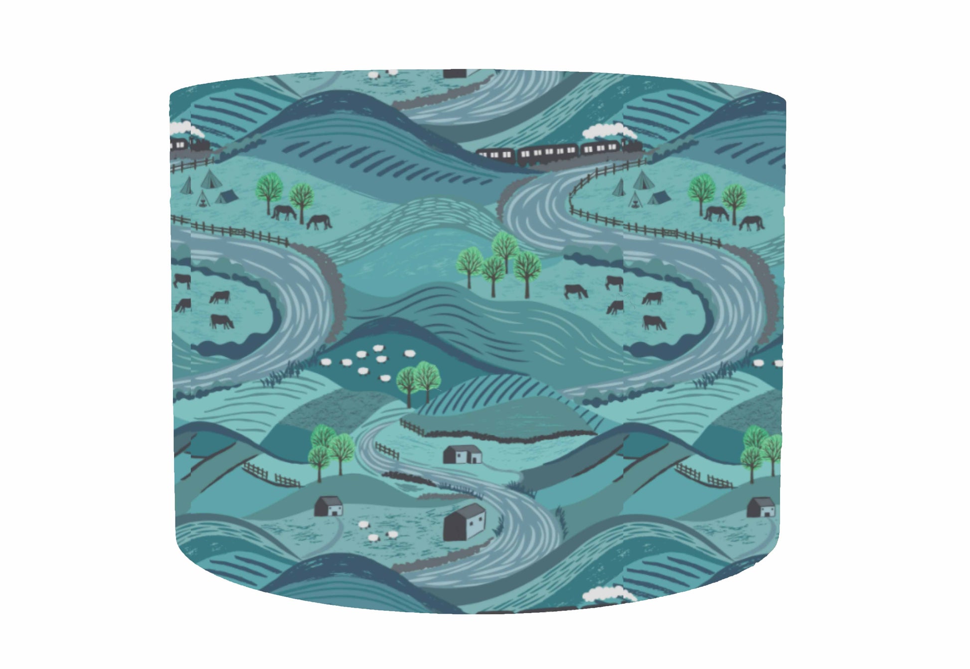 A lovely scenic landscape lampshade, With scene of countryside and a railway line, set on a teal background.