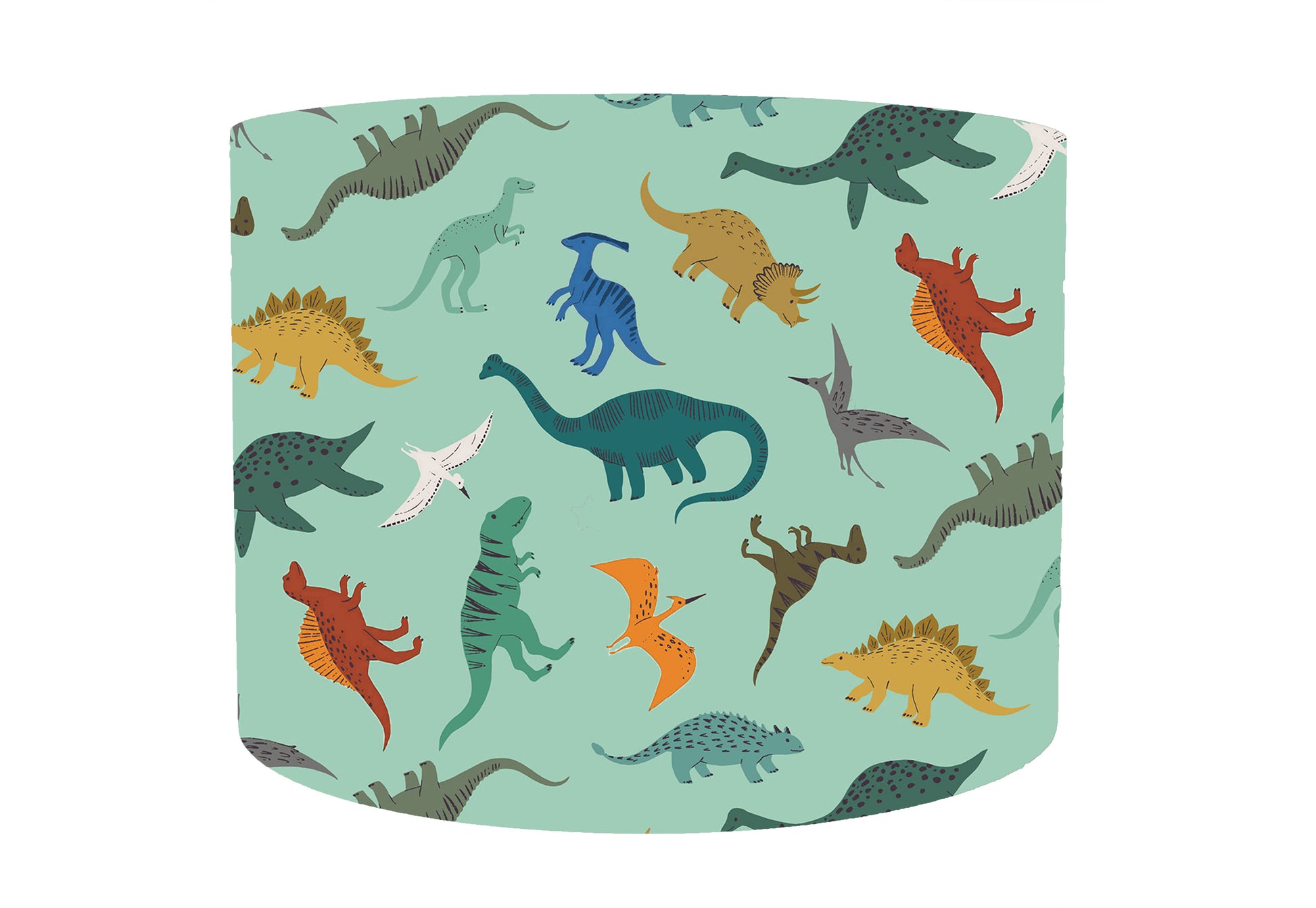 A cute colourful dinosaur lampshade set on a mid green/blue background.