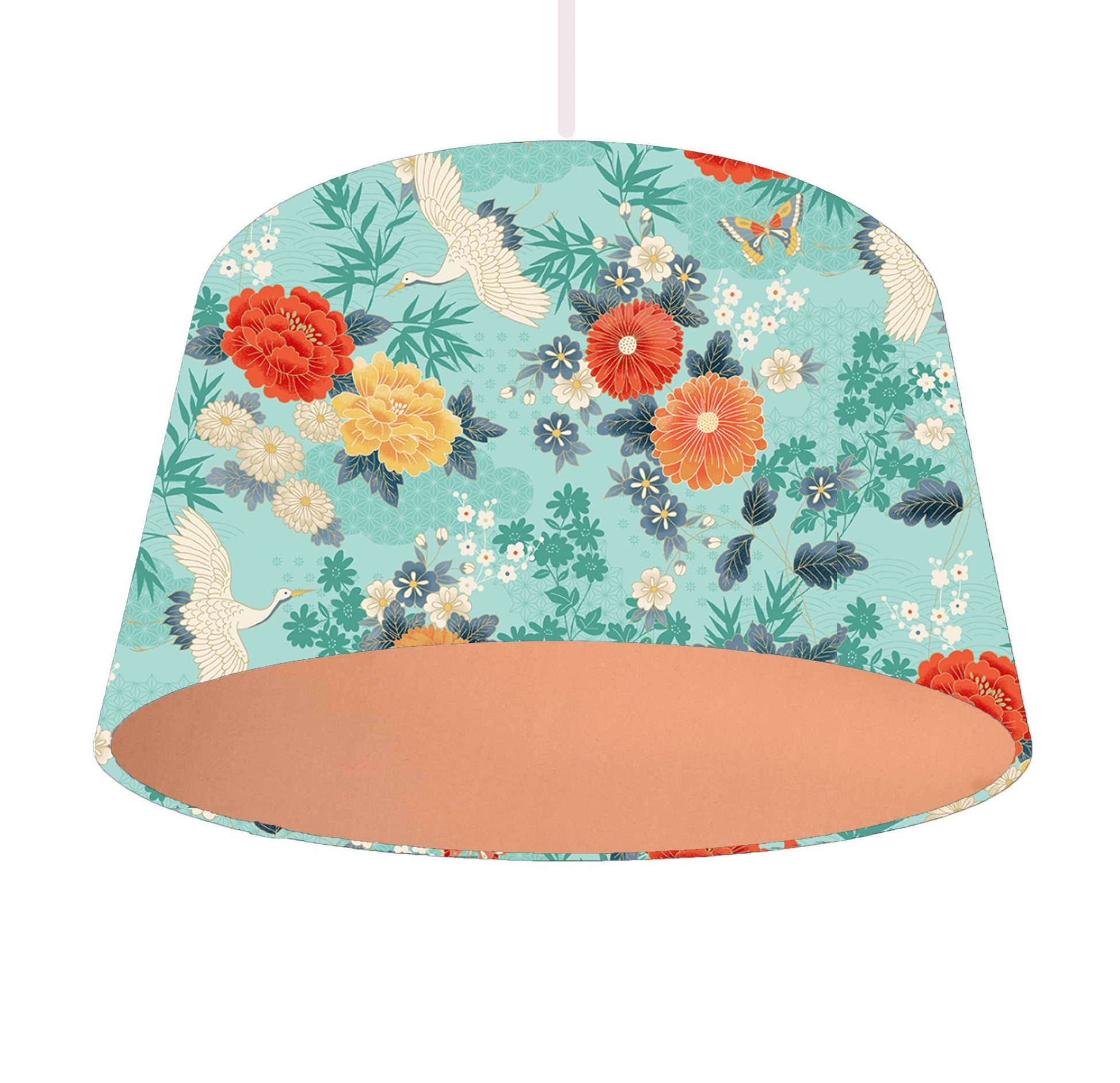 A Japanese themed lampshade, with cranes, flowers and butterflies set on a turquoise background. This listing is for the metallic lining.