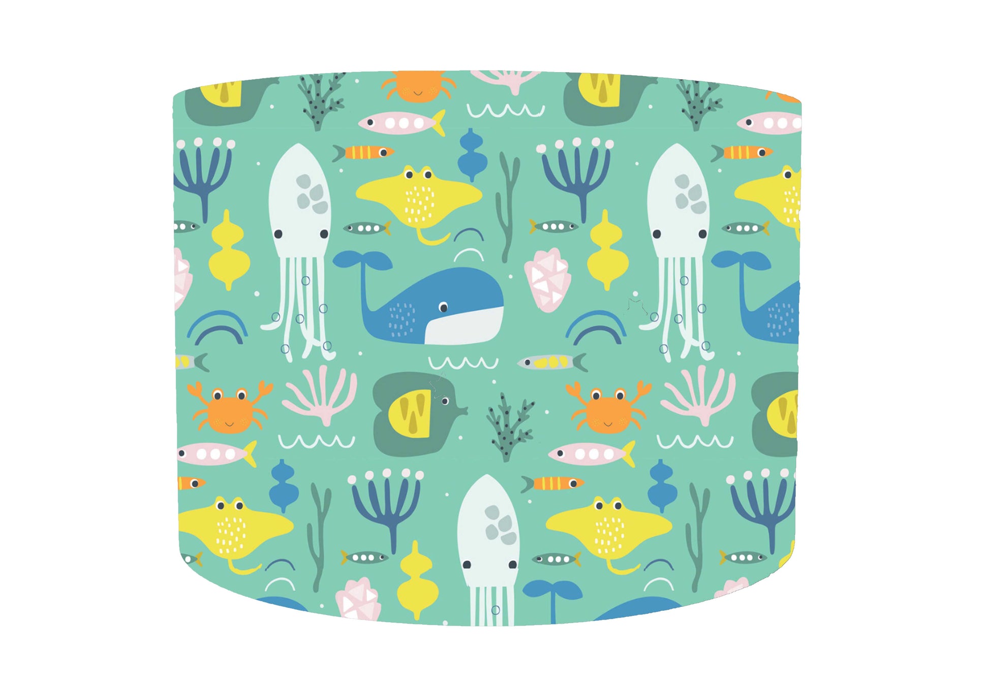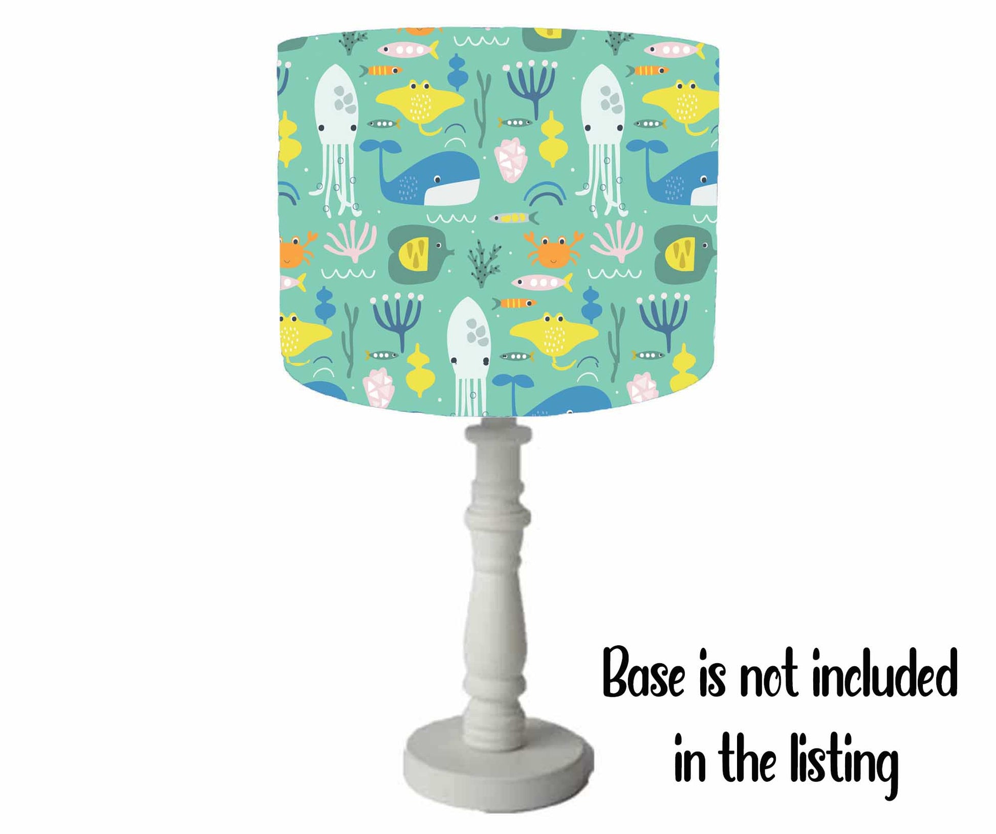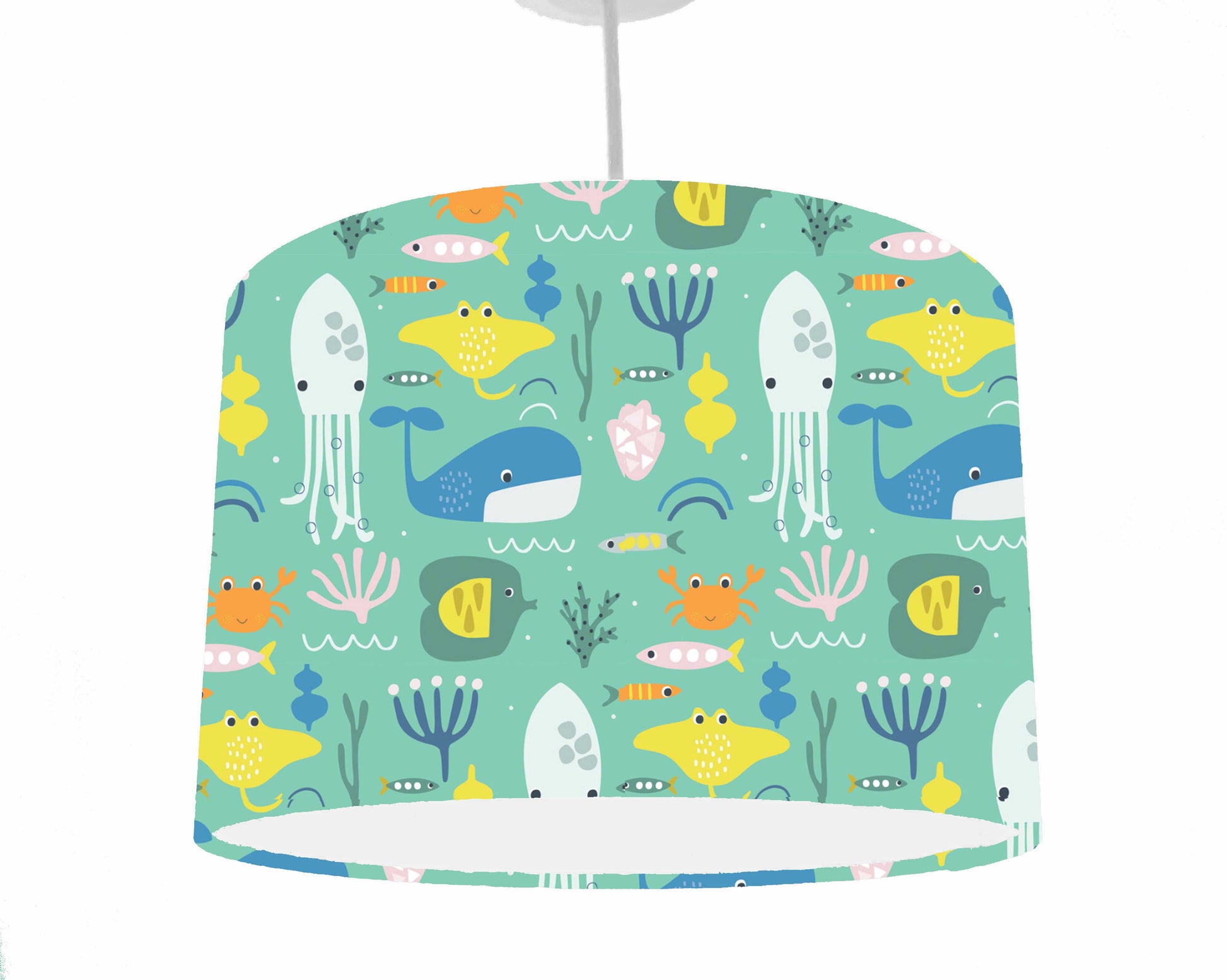 A delightful under the sea themed lampshade. With different sea creatures set on a lovely green background. This is an adorable lighting accessory for your child's room. Great for an ocean themed nursery or an under the sea themed bedroom. Available in four different diameter sizes and can be made to fit a ceiling pendant or table/floor standing base.